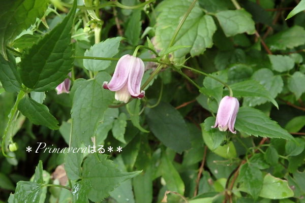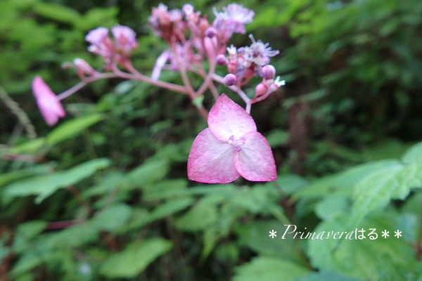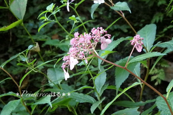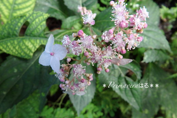 薄いピンクのヤマアジサイ。葉はアジサイに比べて薄く、光沢がなく小さめです。