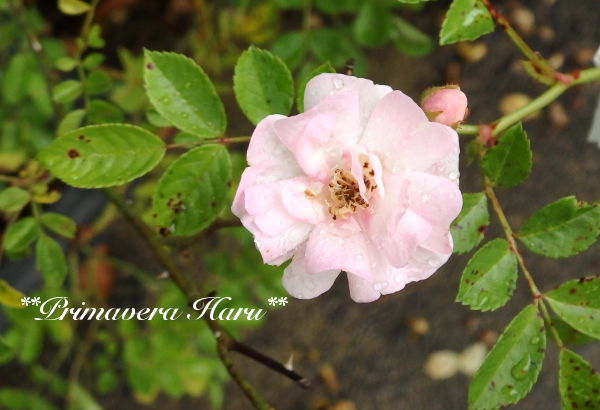 つるバラなので今年やっと蕾が出来て咲きました。多分レンゲローズの種から産まれたバラです。花は小さいです。