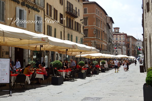 9時を過ぎてくるとCorso Pietro Vannucci(コルソ ピエトロ ヴァンヌッチ)も人が多くなりました。通りを挟んで両脇の建物にはお店がいろいろあります。